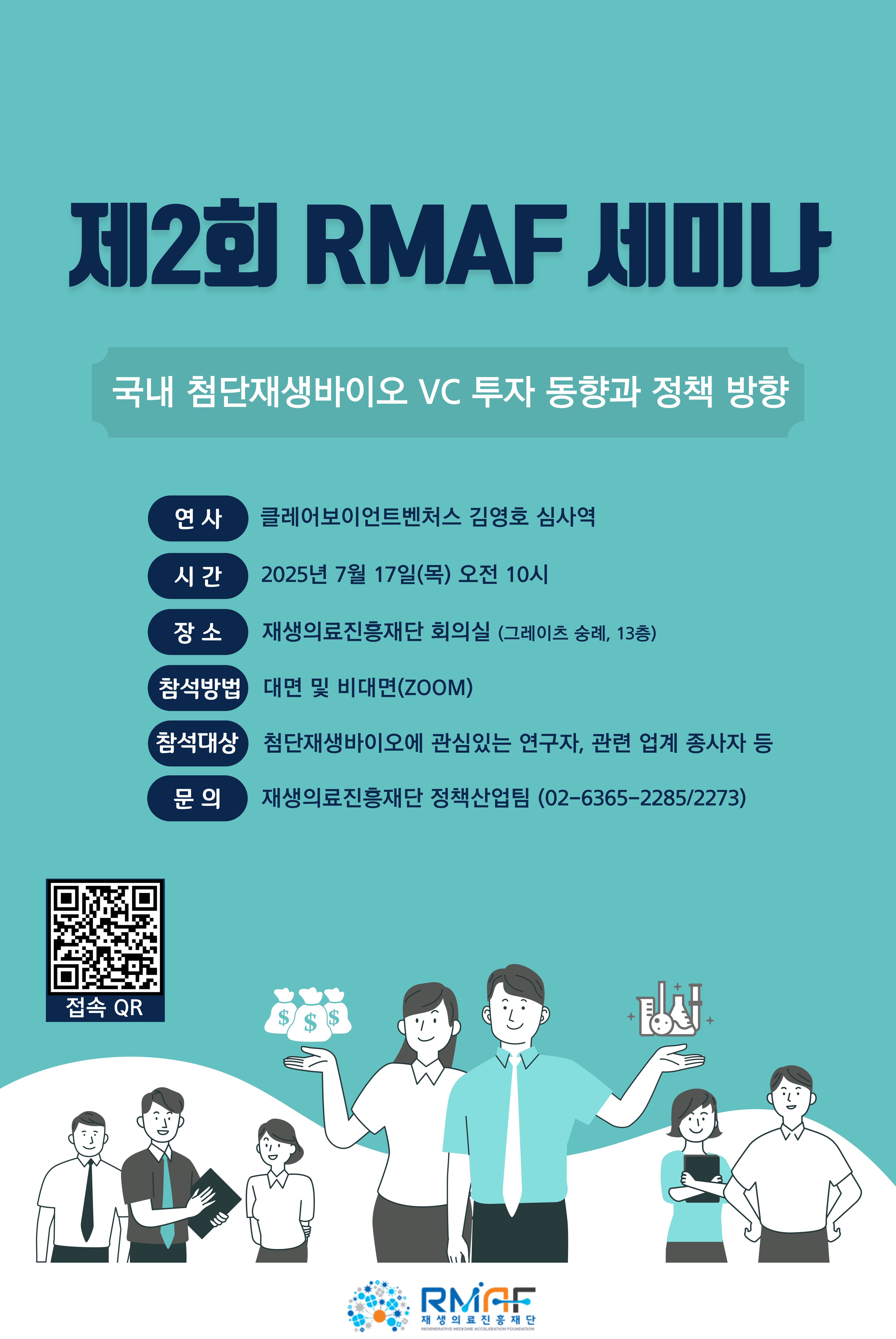 ▶ 행사명: 2025년 제2회 RMAF Seminar ▶ 일시: 2025.7.17.(목) 10:00~11:20 ▶ 장소: 재생의료진흥재단(서울특별시 중구 세종대로 17, 그레이츠숭례 13층) ▶ 주제: 국내 첨단재생바이오 VC 투자 동향과 정책 방향 ▶ 발표자: 클레어보이언트벤처스 김영호 심사역 ▶ 참여방법: - (대면) 재생의료진흥재단 회의실 - (비대면) ZOOM 링크 및 포스터 QR코드를 통해 접속 *비대면 참석 시, [소속/성명/직위]로 이름 설정 ▶ 접속링크 - 링크: https://us06web.zoom.us/j/83189891759 - 회의ID: 831 8989 1759 ▶홈페이지: https://www.rmaf.kr/notice/notice.php?ptype=view&idx=1036&code=notice&page=1&code_page=notice