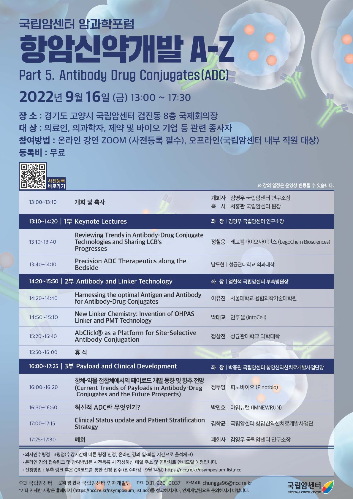 국립암센터 암과학포럼은 의생명과학 분야의 최근 이슈에 대해 최고 수준의 전문가를 모시고 강의와 토론의 장을 제공하고 있습니다. 오는 9월 16일 금요일에는 ‘항암신약개발 A-Z’ 의 일환으로, ‘Part 5. Antibody Drug Conjugates(ADC)' 이라는 주제로 암과학포럼을 개최할 예정입니다. 이번 포럼은 많은 분들이 관심을 갖고 계신 'Antibody Drug Conjugates' 을 주제로 준비하고 있으며, 특히 학계·기업 등 각 분야의 전문가를 모시고 원활한 교류와 협력의 장을 마련하고자 기획되었습니다. 관심 있는 분들은 아래 <사전등록> 링크를 통해 접수 부탁드립니다. 감사합니다. ○ 주 제: 항암신약개발 A-Z, Part5. Antibody Drug Conjugates(ADC) ○ 일 시: 2022년 9월 16일(금) 13:00~17:30 ○ 장 소: 국립암센터 검진동 8층 국제회의장, ZOOM(온라인 실시간 강의) ○ 대 상: 의료인, 의과학자, 제약 및 바이오 기업 등 관련 종사자 ○ 평 점: 대한의사협회 3평점(수강시간에 따라 평점 인정) ○ 사전등록: 바로가기 ( 클릭 ) 혹은 QR 코드(포스터 참고)를 통한 접수 (기한: 9월 14일까지) ○ 등 록 비: 무료 ○ 문 의: 인재개발팀 박수연(내선 0037), chungga96@ncc.re.kr ※ 해당 포럼은 온라인 ZOOM으로 실시간으로 진행될 예정입니다. ※ 사전 등록을 하신 분에 한해 참여가 가능하므로 필히 등록 부탁드립니다.