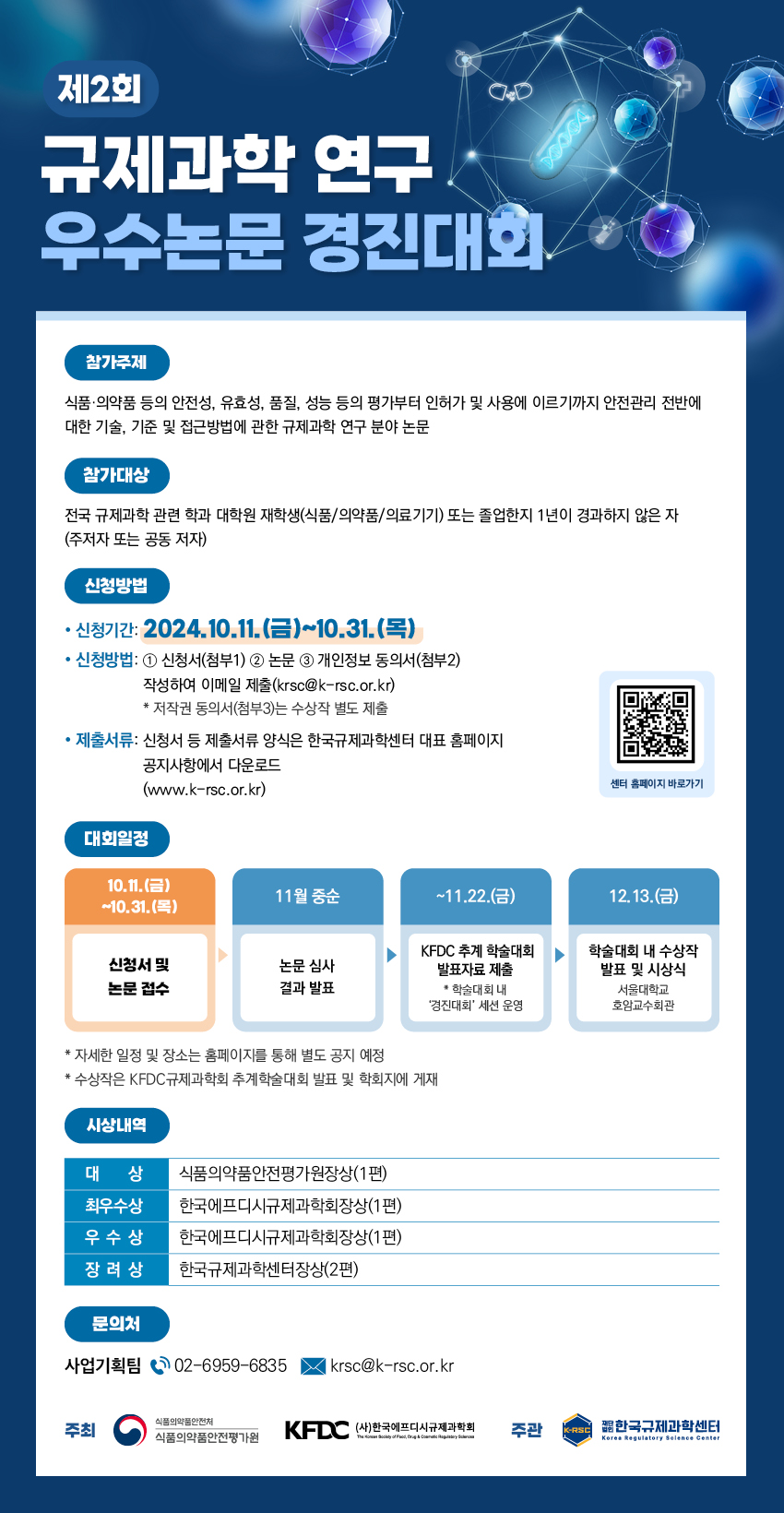 - (대 회 명) 제2회 규제과학 연구 우수논문 경진대회 - (참가주제) 식품ㆍ의약품 등의 안전성, 유효성, 품질, 성능 등의 평가부터 인허가 및 사용에 이르기까지 안전관리 전반에 대한 기술, 기준 및 접근방법에 관한 규제과학 연구 분야 논문 - (참가대상) 전국 규제과학 관련 학과 대학원 재학생(식품/의약품/의료기기 등) 또는 졸업한지 1년이 경과되지 않은 자 - (신청기간) 2024.10.11.(금) ~ 10.31.(목) - (신청방법) ① 신청서(첨부1) ② 논문 ③ 개인정보 동의서(첨부2) 작성하여 이메일 제출(krsc@k-rsc.or.kr) - (문 의) 한국규제과학센터 사업기획팀 이메일(krsc@k-rsc.or.kr) 또는 전화(02-6959-6835) 문의