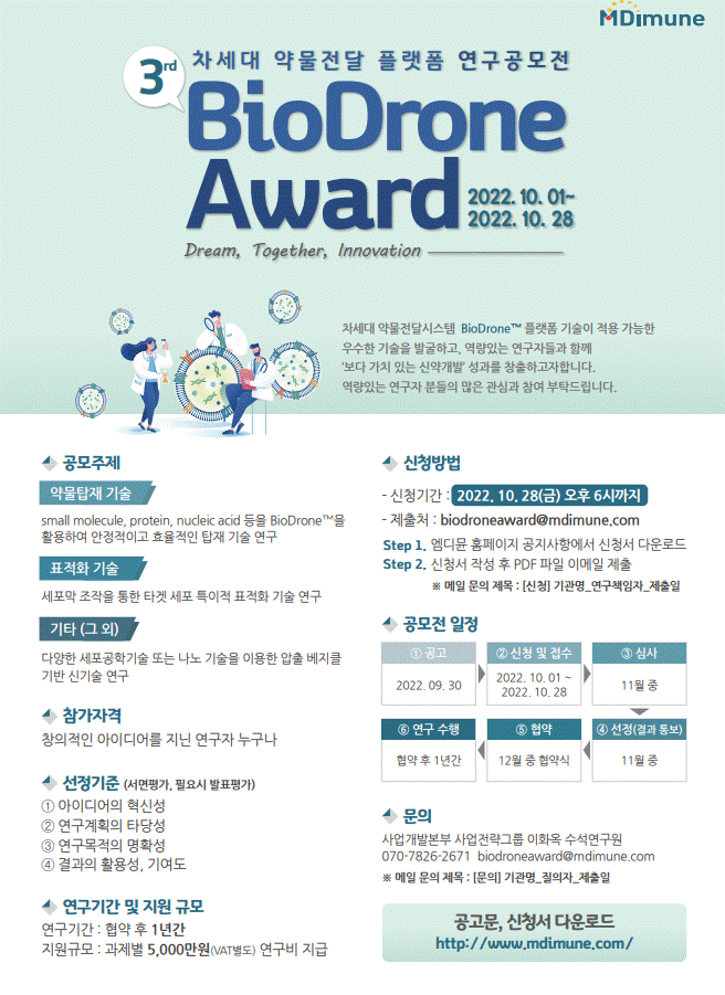 당사의 약물전달시스템 기술과 접목할 수 있는 창의적인 아이디어를 가진 연구자의 발굴과 지원을 위해 '제3회 바이오드론 어워드'를 개최하여 연구과제를 공모하고 있습니다.